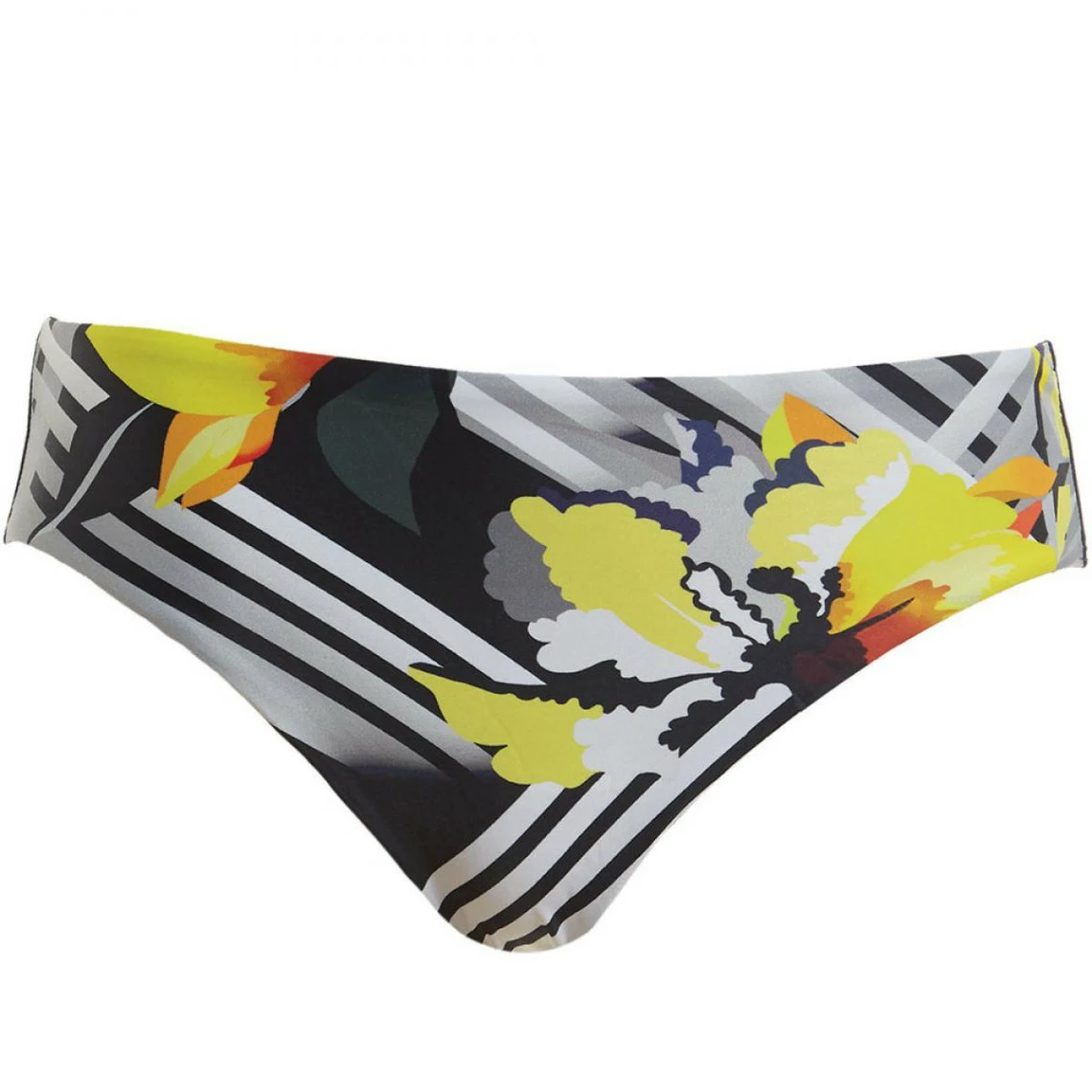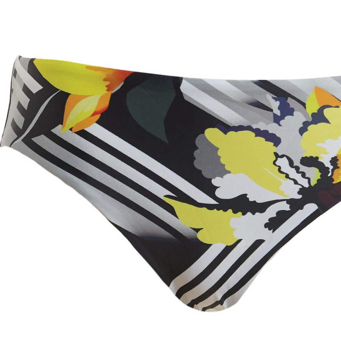 La marque Fantasie Bain répond à tous vos besoins de confort, d’élégance et de féminité avec le Slip de bain mi-couvrant imprimé – Noir de la collection Béziers.