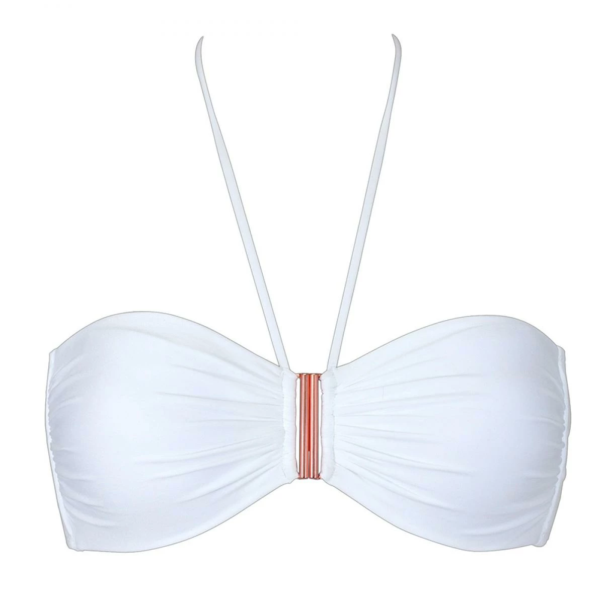 Voici un superbe bandeau de la ligne Summer Solids qui vous est présenté en un sublime coloris blanc. Indémodable, cette couleur saura mettre en valeur les peaux bronzées de l’été. Ce bandeau est élaboré d’une maille très douce et lisse adapté spécialement pour le bain qui vous apportera un confort maximal. Les bonnets disposent de coussinets en mousse non amovibles afin d’éviter toute transparence au contact de l’eau. De part et d’autre de la poitrine, ce bandeau contient deux armatures rigides de chaque côté pour apporter un maintien de la poitrine avec bien-être. A l’avant, les bonnets sont légèrement plissés ce qui donne une touche très féminine et élégante à cette pièce de bain. Sans fermeture à l’arrière, ce bandeau dispose d’un système de fermeture à l’avant au niveau de l’entre-sein grèce à une attache de couleur rose cuivré qui s’emboite et se coulisse à la verticale. Les bretelles ne sont pas amovibles. Si vous souhaitez éviter les traces de bronzage, il sera possible de faire un noeud à l’avant. L’empiècement arrière est décoré par une jolie bande striée et élastique qui permettra de s’adapter parfaitement à votre tour de dos.